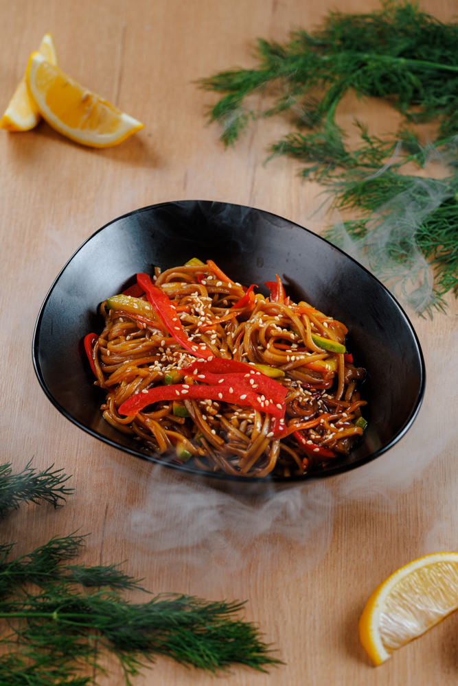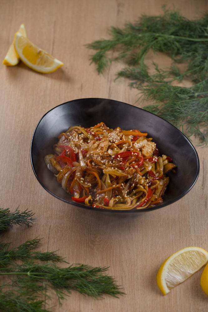 удон, куриное филе, лук, морковь, перец болгарский, соевый   соус, соус терияки