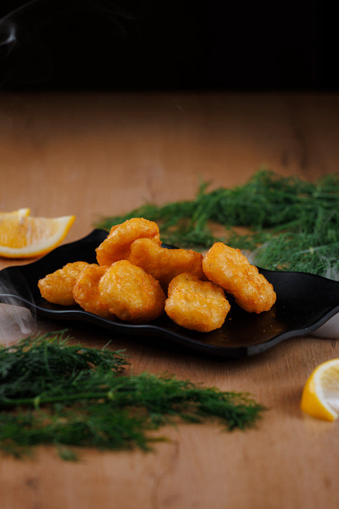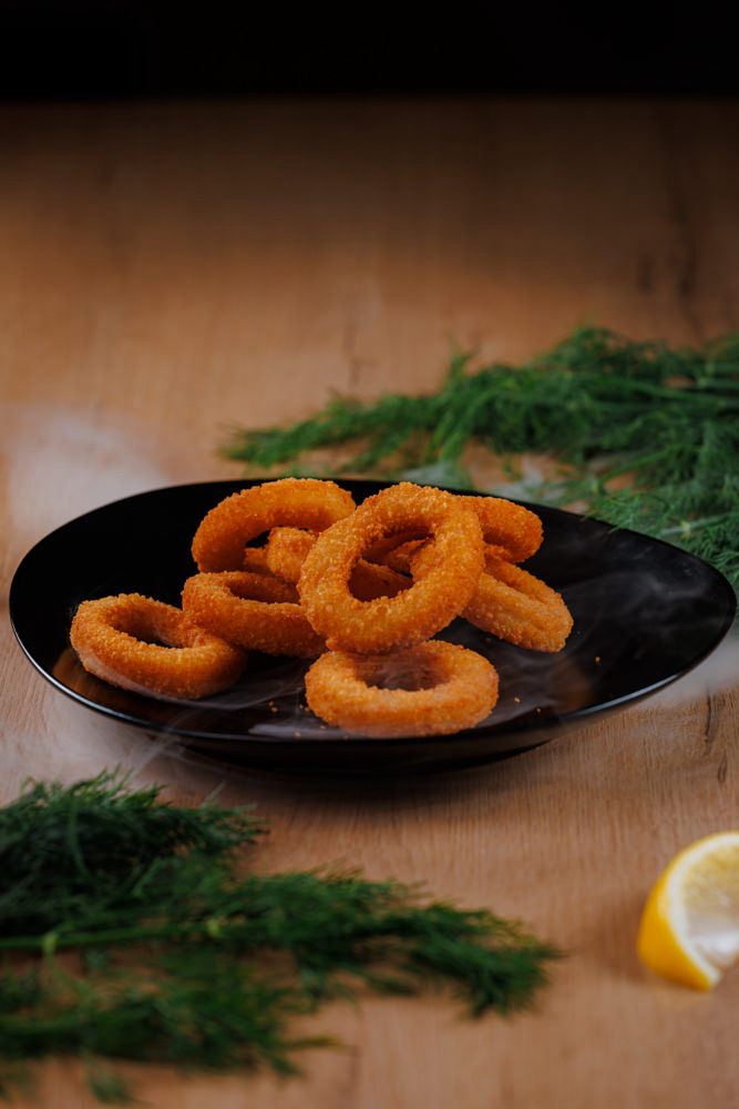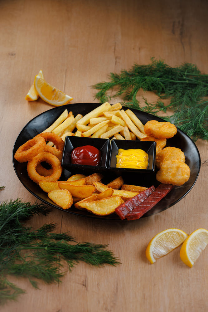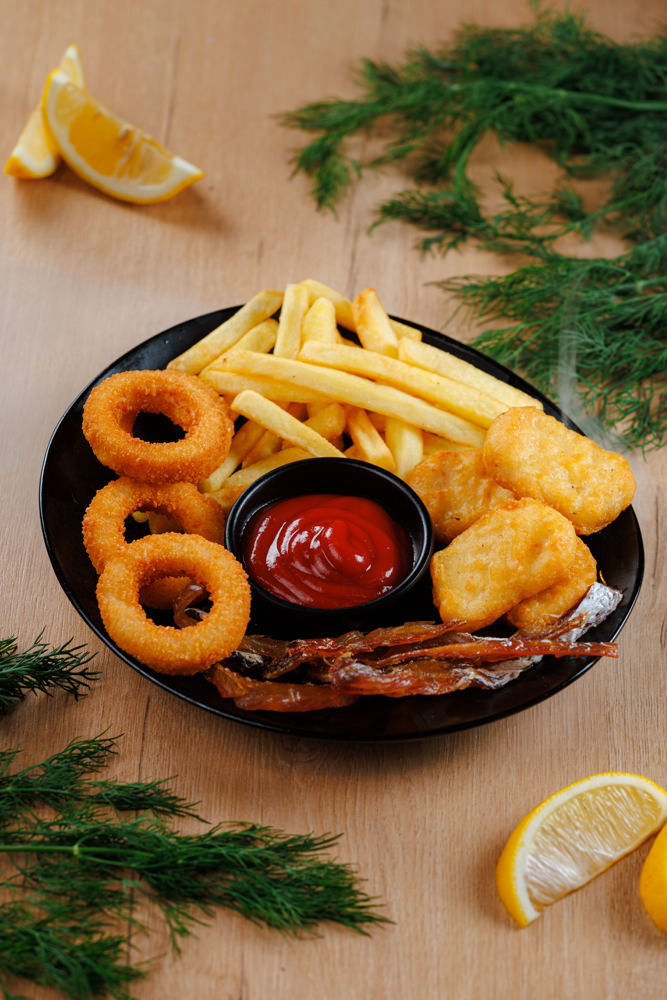 картофель фри, луковые кольца, наггетсы, пивчики, картофельные дольки, кольца кальмара, соус чесночный, кетчуп