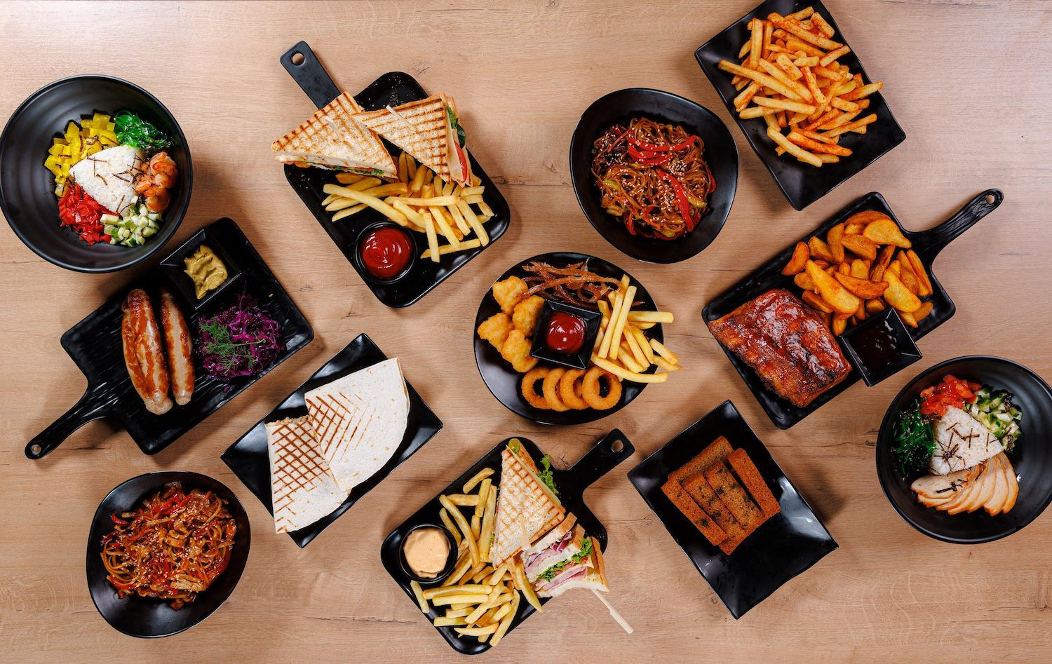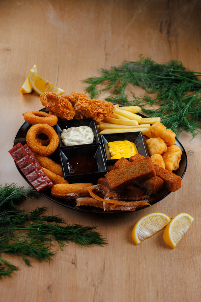 картофель фри, луковые кольца, наггетсы, пивчики, гренки, кольца кальмара, сырные палочки, крылышки куриные, рыбные снеки, соус чесночный, кетчуп, соус BBQ