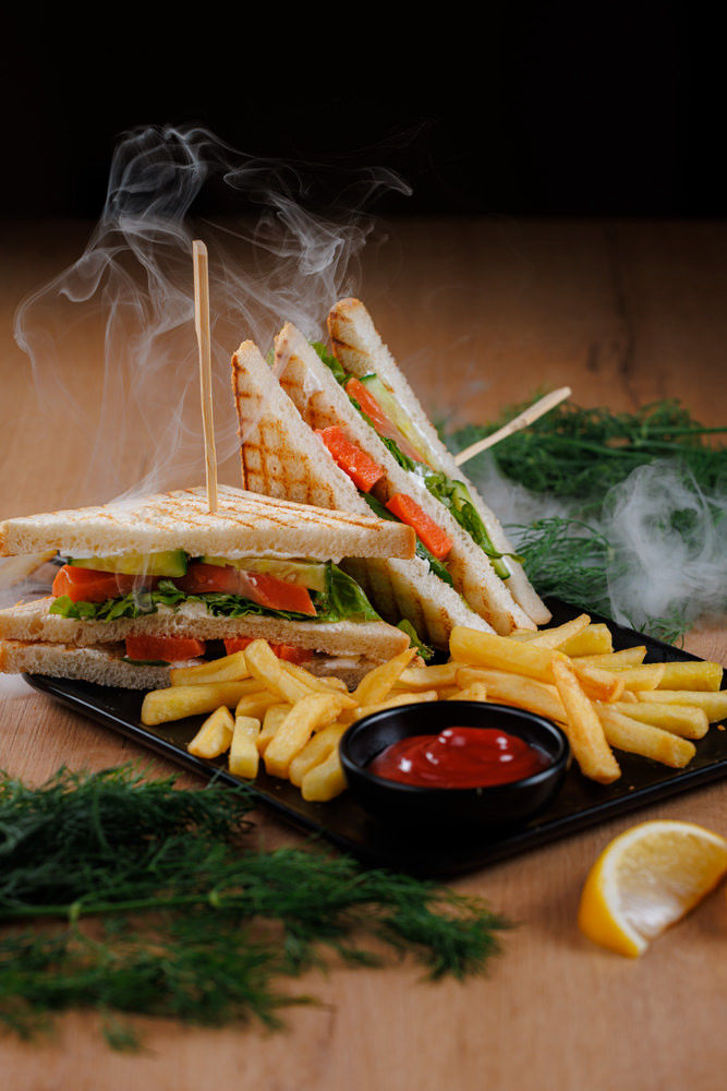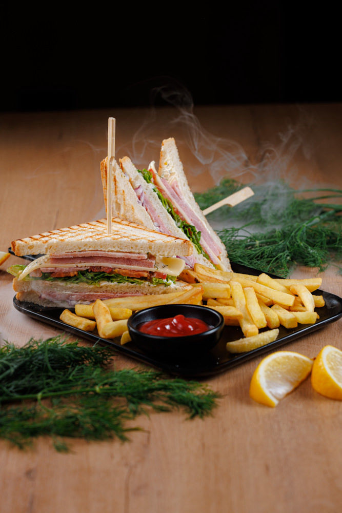 хлеб тостовый, ветчина, помидор, красный лук, сыр чеддер лист салата, соус чесночный, картошка фри, кетчуп
