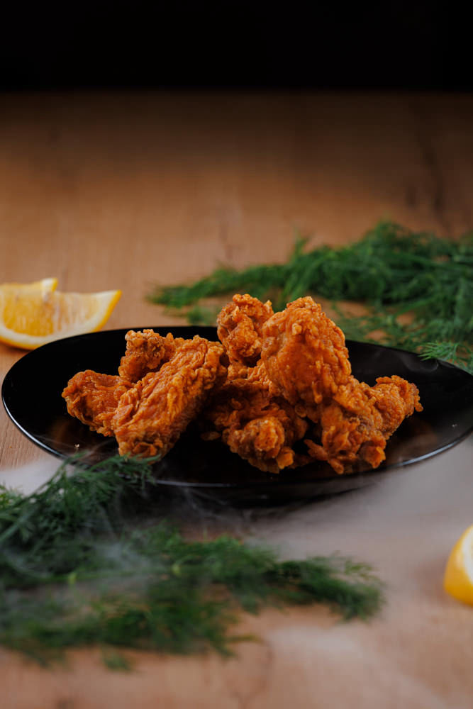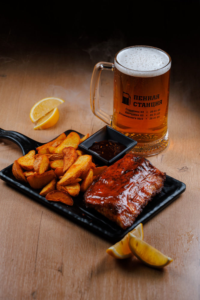 рёбра свиные, паприка, картофельные дольки, соус барбекю, соус шрирача