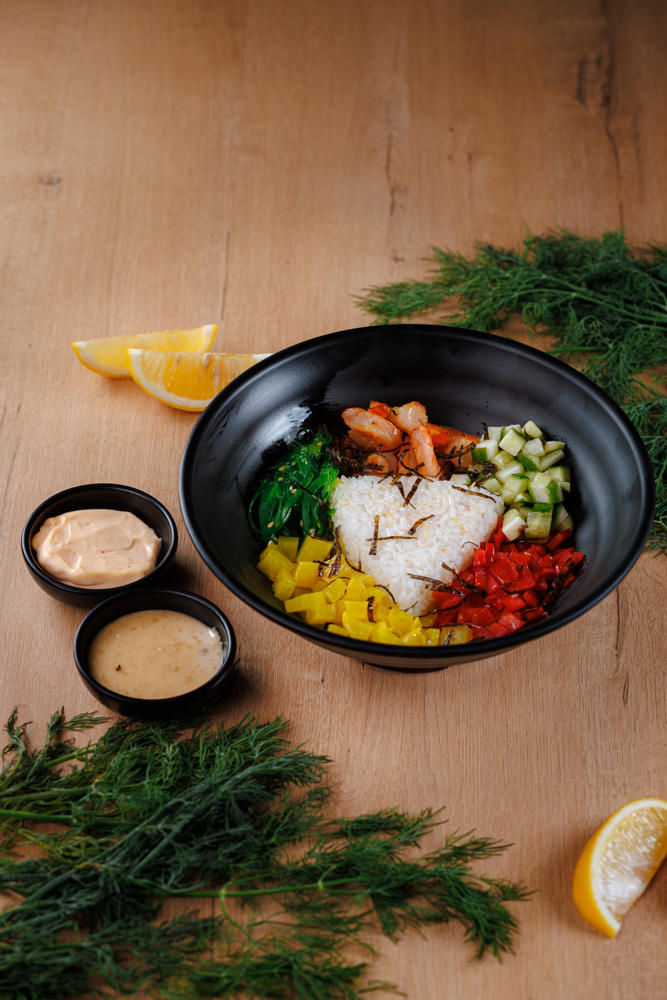 рис, перец болгарский, дайкон, креветки, кукуруза, чука, нори, кунжут, соус ореховый