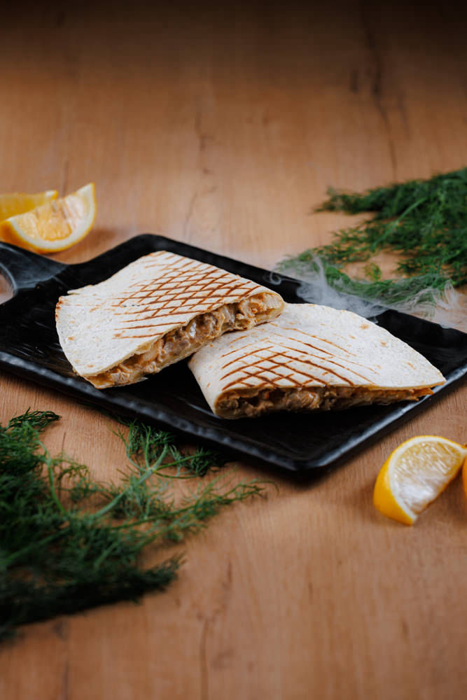 тортилья, куриное филе, шампиньоны, лук, сливки
