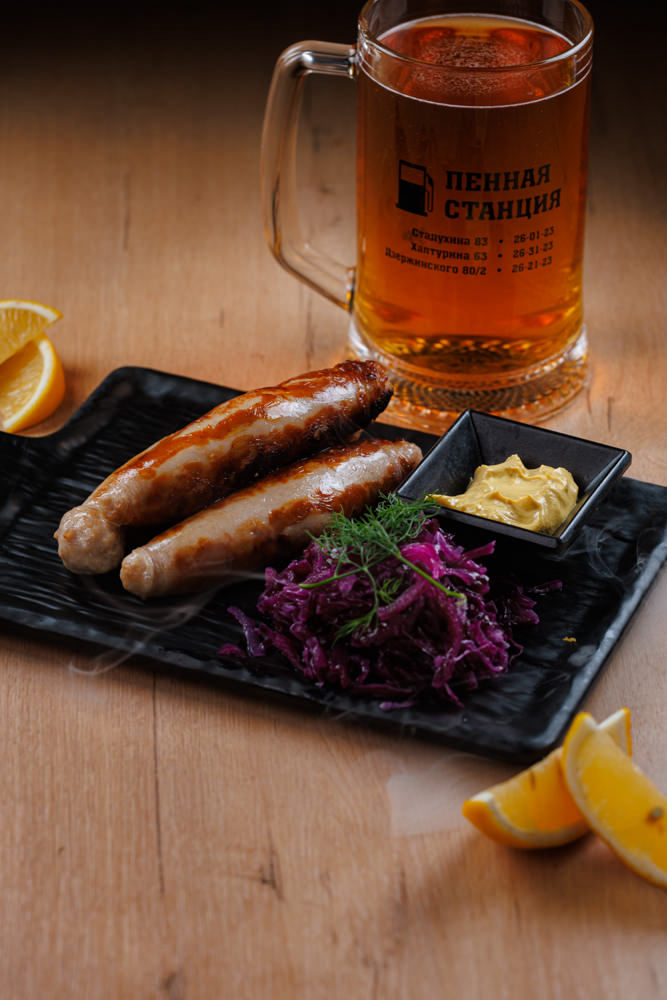 купаты куриные, капуста маринованная, горчица дижонская, зелень